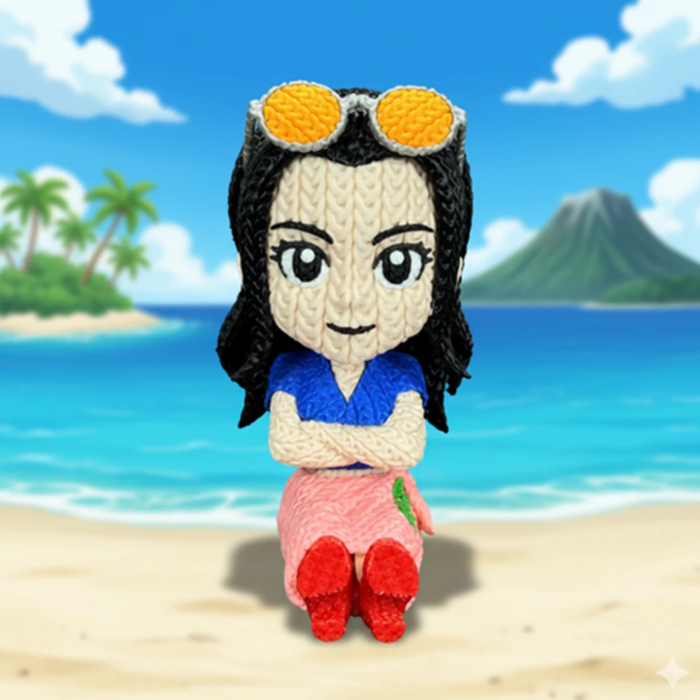 The knitted-style detailing gives Robin a handcrafted, warm feel while preserving all her iconic traits—from her stylish outfit to her poised hand gestures. Carefully 3D printed with clean detailing, this figure is perfect for desks, shelves, or any One Piece-themed display setup.