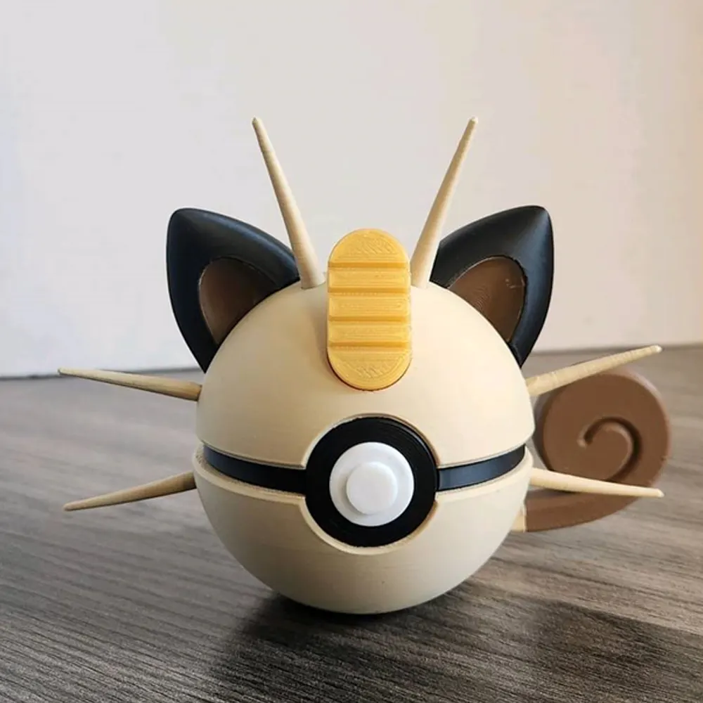 Add a touch of playful Pokémon charm to your collection with this Meowth Pokéball (Openable Edition). Inspired by the iconic Meowth, this 3D printed Pokéball opens smoothly to reveal a detailed inner figure, making it both interactive and visually appealing.